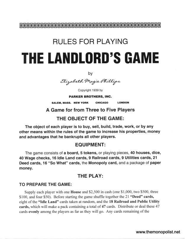 FYI there are two schools of thought regarding Monopoly history, first the corporate viewpoint as espoused first by Parker Brothers, and then Hasbro. At first this was to falsely claim that Charles Darrow was the sole inventor, but later morphed, in the face of undeniable facts to the contrary, into simply preserving the Monopoly trademark and intellectual property above all else.